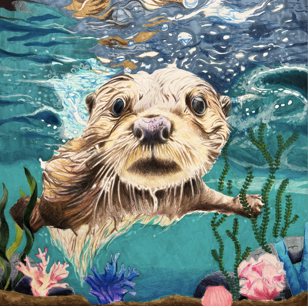 Colored Pencil and Marker art piece of an otter close up, swimming through kelp and reef in turquoise water