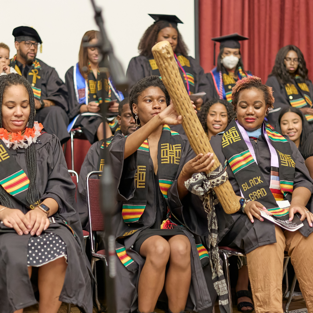 SMC alumnus Lloyd Schine ’98, ME ’04, MA ’14, director of institutional advancement at Bay Scholars, presented graduates with their alumni pins. After the kente cloth presentation, graduates participated in the tradition of passing a rainstick, and recited the Ghanaian Adinkra phrase “Nea onnim no sua, a ohu,” meaning “One who does not know can know from learning.”