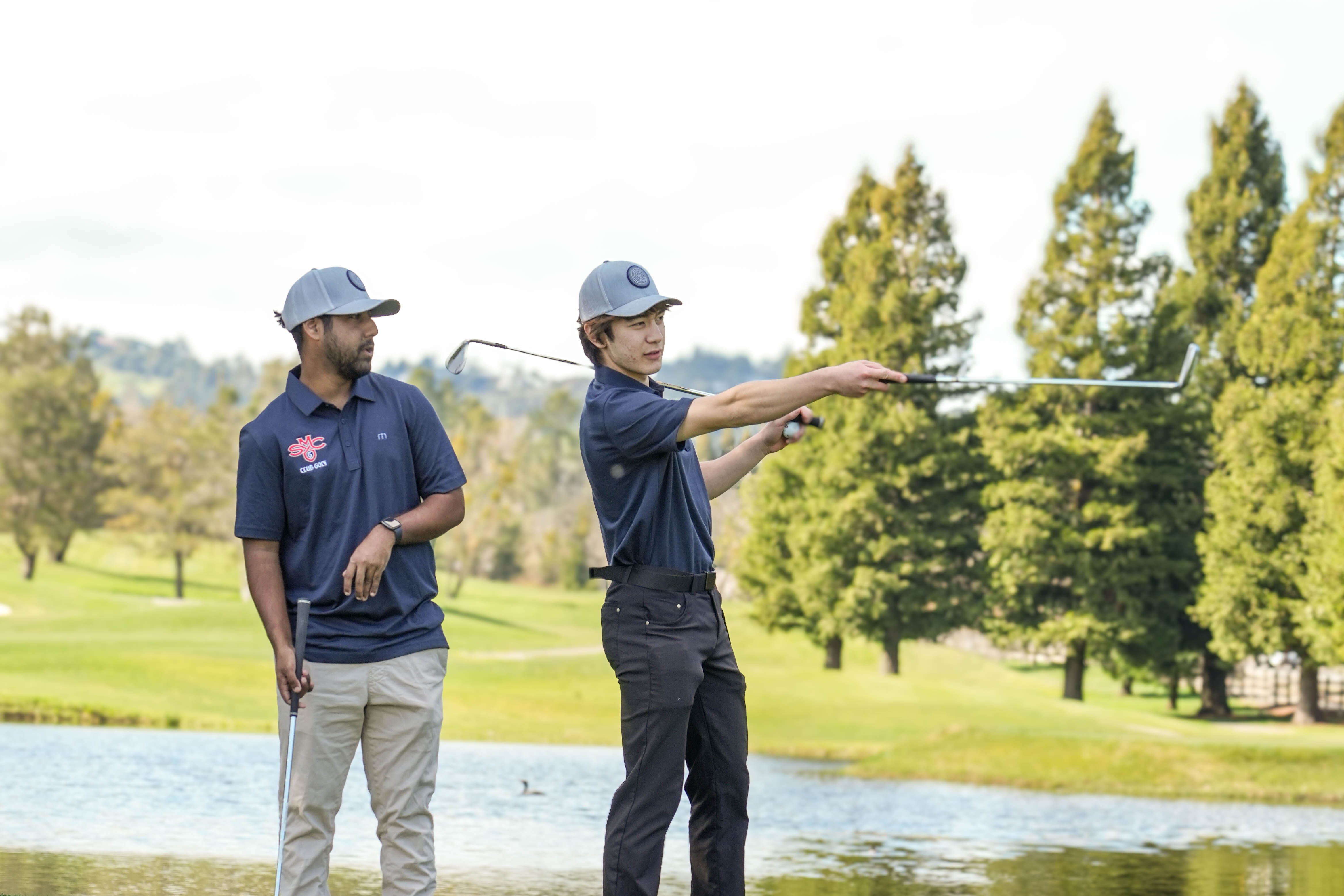 Keyaan Maqsood ’26 and Matthew Manzi ’26 find the right angle during practice at Moraga Country Club as they prepare for the National Collegiate Club Golf Association Tournament on March 2 and 3. / Photo by Dominic Russo ’24