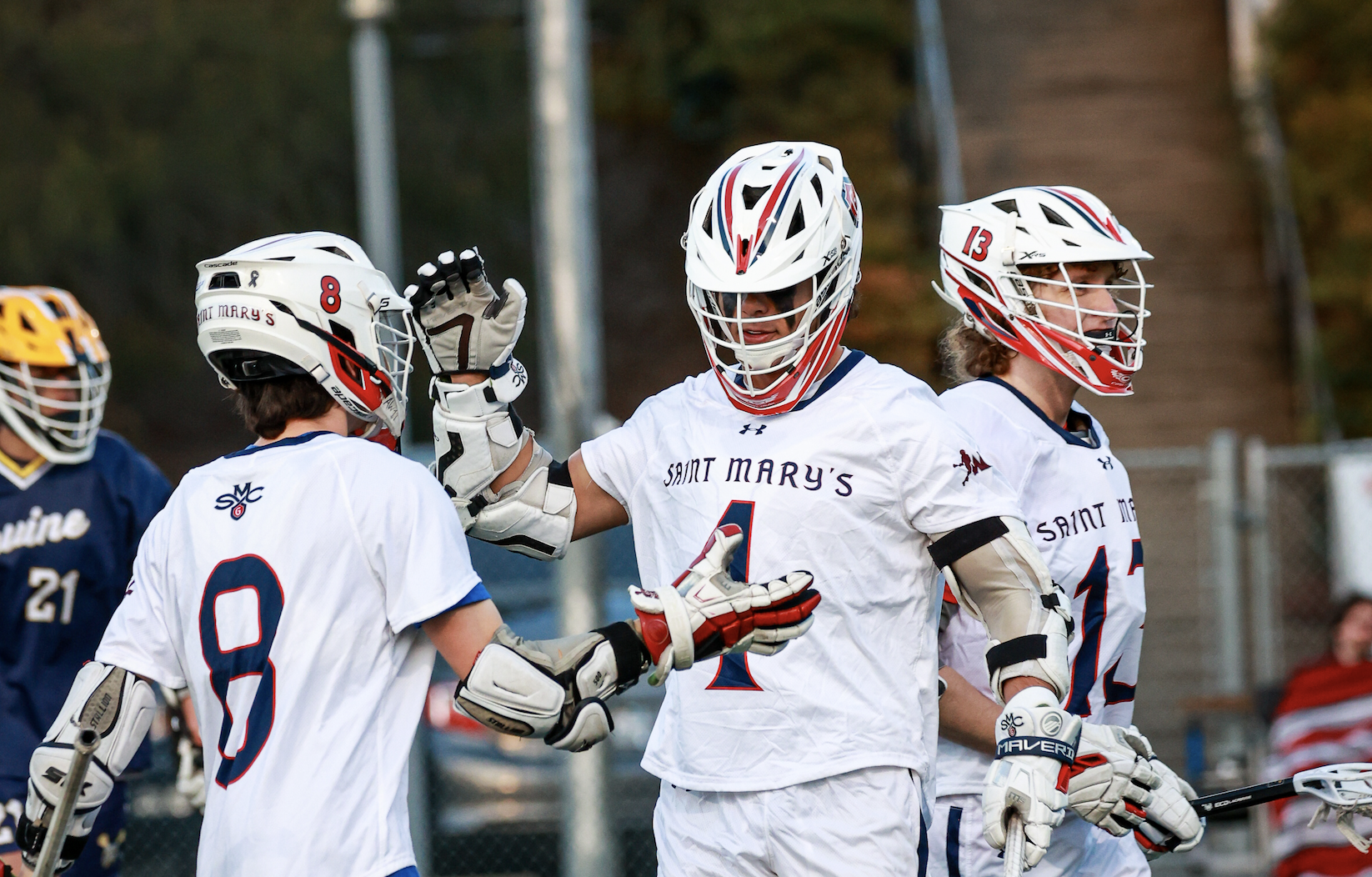Gaels Goal: Men’s Lacrosse team members Tim Daly (No. 8), Dario Caccia (No. 4), and Hayden Bradley (No. 13) celebrate after scoring against UC Irvine in a match on the Recreational Turf Field last Spring. / Photo by Ashleen Rai ’26
