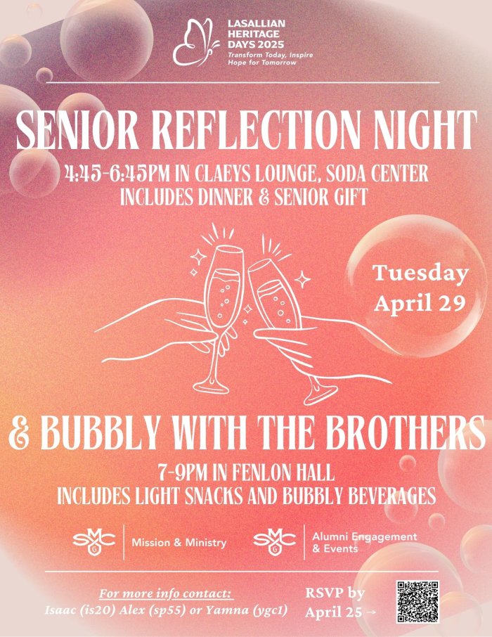 Graduating students are invited to join us for a Senior Reflection Night and Bubbly with the Brothers event on Tuesday, April 29th from 4:45-9:00pm.