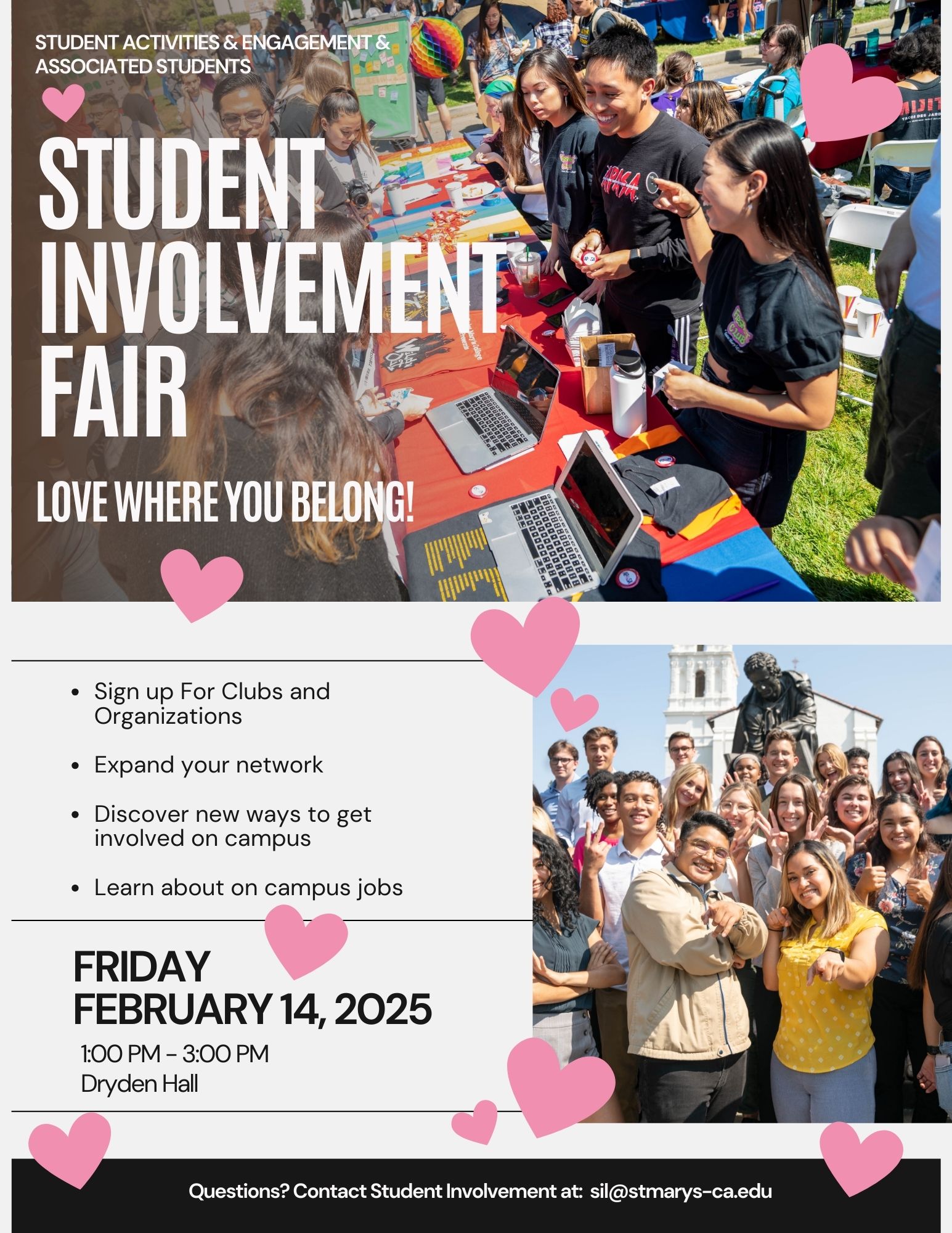 Come to the Student Involvement Fair! You can meet representatives from student clubs and organizations, Club Sports, and several campus departments.