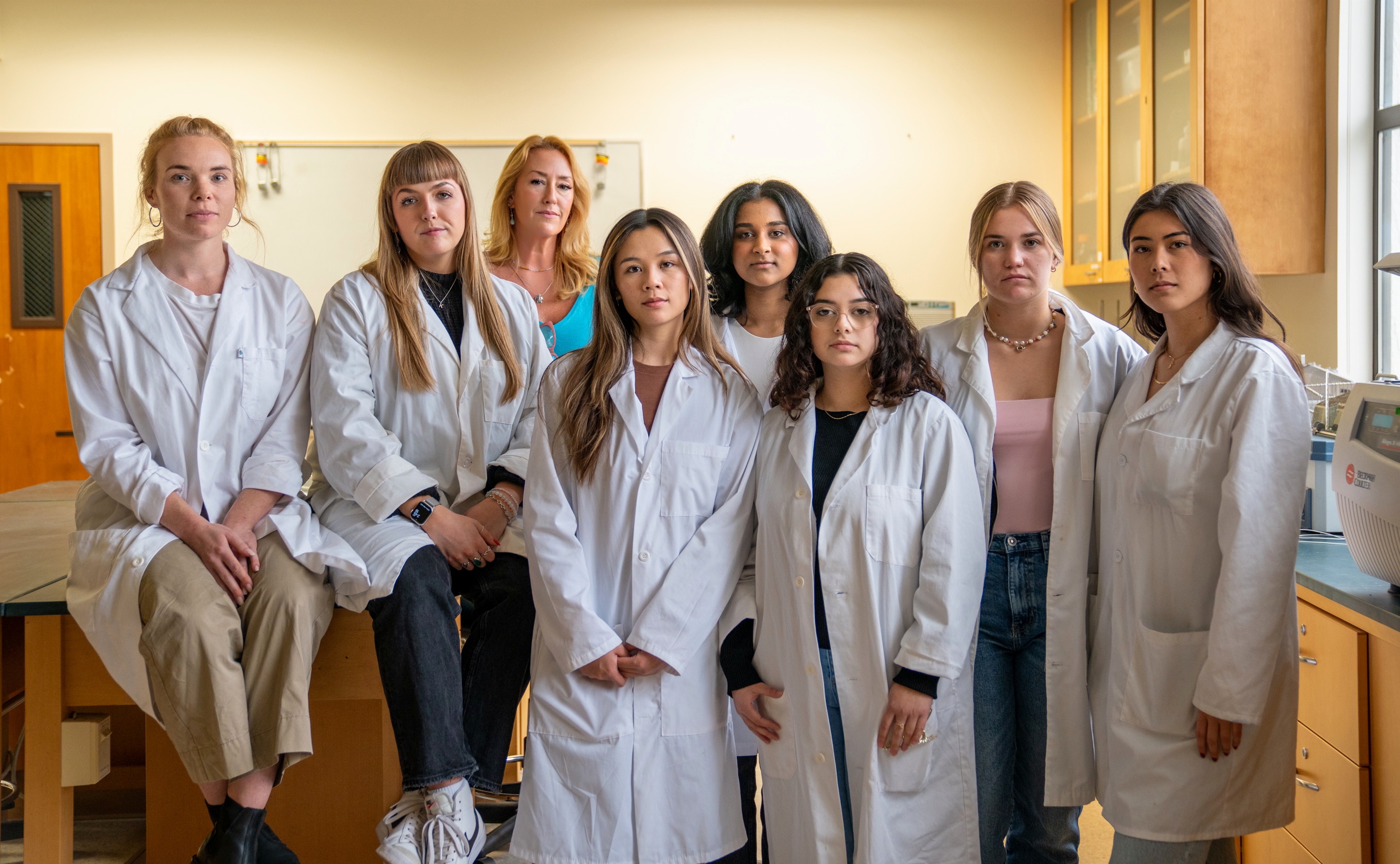 In the lab: Professor of Biology Sonya Schuh, third from left, and some of the students who have worked with her on research featured in The Plastic Detox. Students in lab coats are, from left: Emry Cohenour ’19, Kristen Harnett ’20, Ashley Chin ’22, Tamana Gill ’23, Kimberly Alvarez ’25, Marissa Woolsey ’23, and Maralyce Martinez ’23. / Photo by Francis Tatem