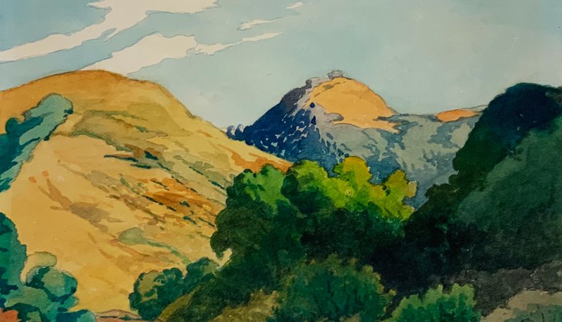 This watercolor, most likely created between 1910 and 1940, exudes the colors and mood specific to the Northern California landscape and the ideals of the Arts and Crafts movement in America. The Arts and Crafts movement emerged during the late Victorian era. Anxieties about industrial life fueled a resurgence in philosophy and practices to promote handcraft designs that debased mechanization and reaffirmed the maker's process in aesthetics, beauty, and simplicity of everyday design. William embodied these craftsman ideals, as he worked in various media seeking to emphasize the process of creating as well as ensuring honesty of materials. He depicted subjects deemed beautiful, such as the natural Californian environment surrounding him.