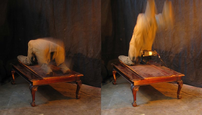 Lifesize Mark Pauline is one of three sculptures modeled after individuals in Spelletich’s development. Named for his long-time friend and creator of the 1978 Survival Research Laboratories, Mark Pauline wears his namesake’s discarded baggy jumpsuit as he shifts from all fours to an upright position on his knees, arms stretched out –emulating the motions of prayer. The sculpture is paired with a digital photograph capturing the celestial extremes of the sun and moon events occurring during the robot’s construction. Spelletich crafts his machines with human-like attributes to provoke, “experiences focused on the somatic and phycological aspects of being human.” Purposeful Breathing Pillow slowly inhales and exhales in the recorded and timed rhythm of Spelletich’s own breathing patterns. As the participant presses down on a button, the air is pulled into the pillowcase inflating the form acutely and then releasing –evoking the haunting sounds and rhythm of life.