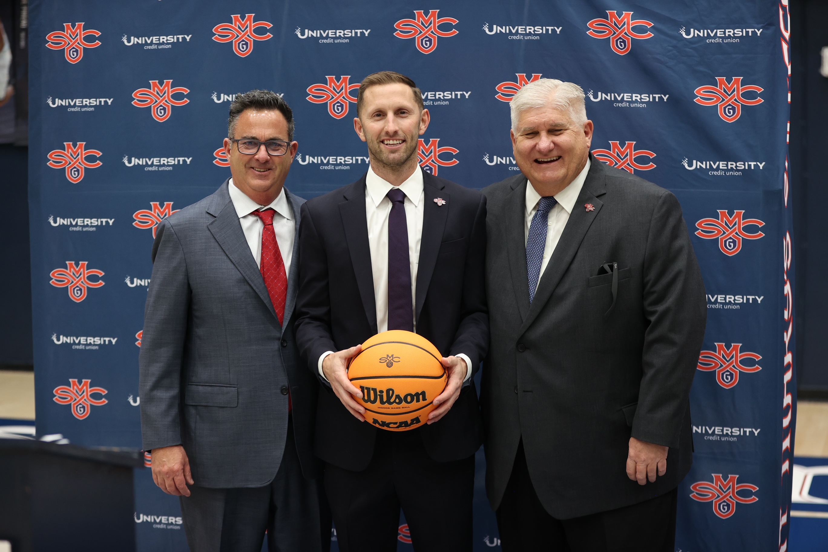 He's Got Game: Smiles all around as Saint Mary’s Vice President for Intercollegiate Athletics Mike Matoso, left, and President Roger J. Thompson, right, welcome new men’s basketball head coach Mickey McConnell to his introductory press conference at UCU Pavilion. / Photo by Tod Fierner for SMC Athletics