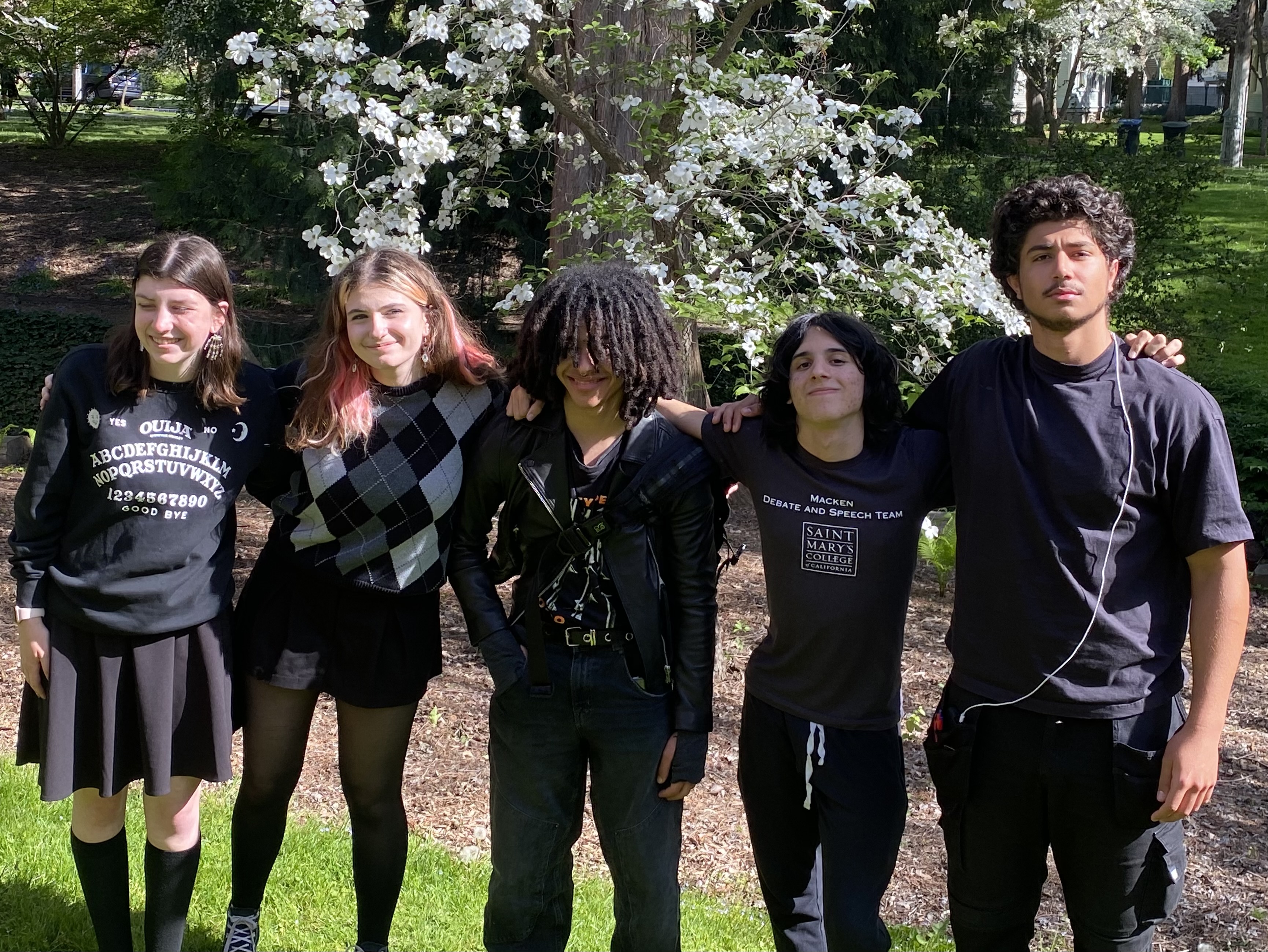 The Macken Debate Team after the National Tournament of Excellence in Walla Walla, Washington: From left, they’re Molly Floberg, Emma Owen, Jasper Pacheco, Adrian Lossada, and Luis Mora. Not pictured: Gavin Hussain, who competed online. / Photo courtesy Macken Debate Team