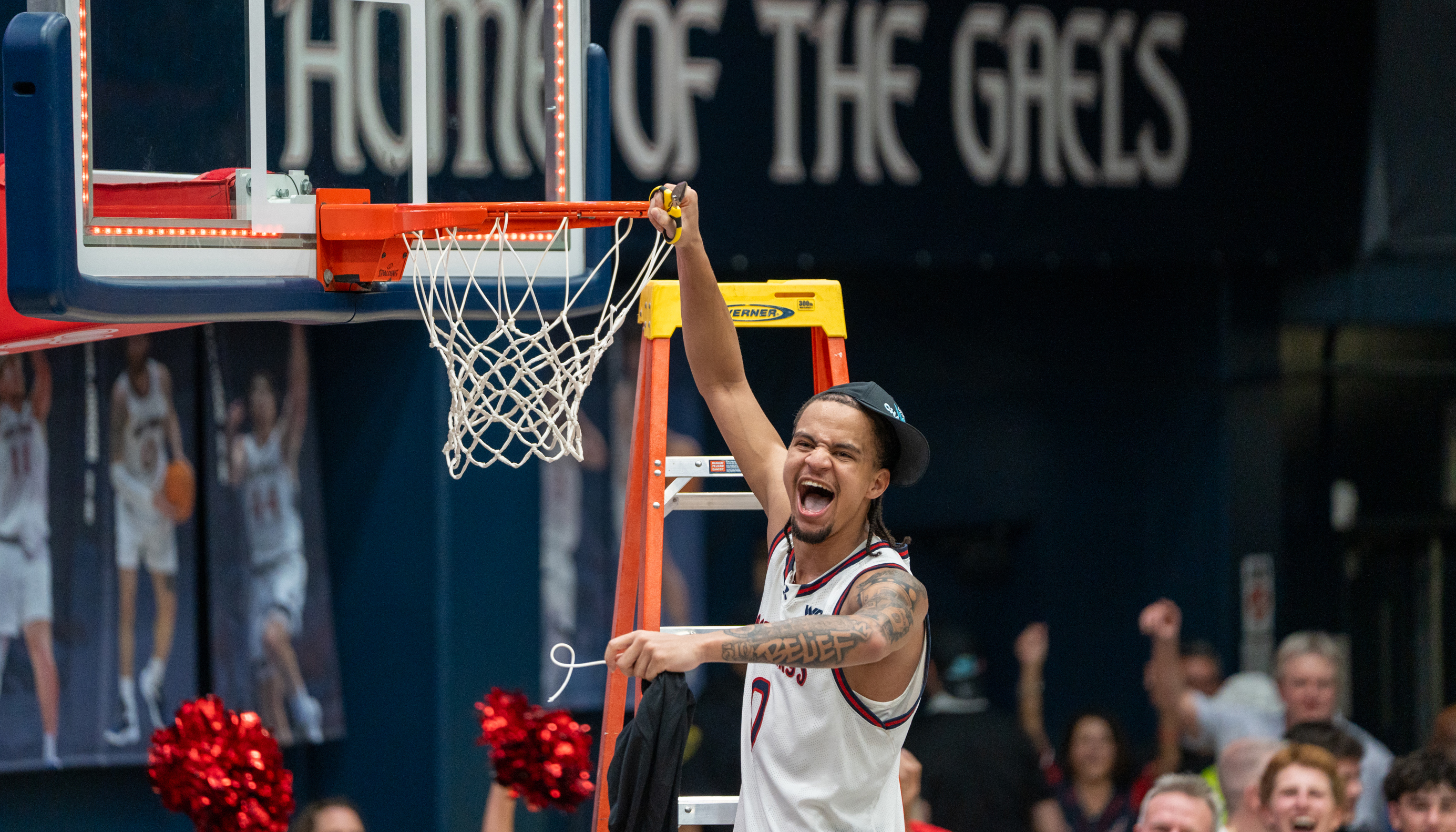 Conference Champs: Mikey Lewis leads the Gaels in cutting down the net after Saint Mary’s defeats Gonzaga to win the West Coast Conference Regular Season Title. / Photo by Francis Tatem