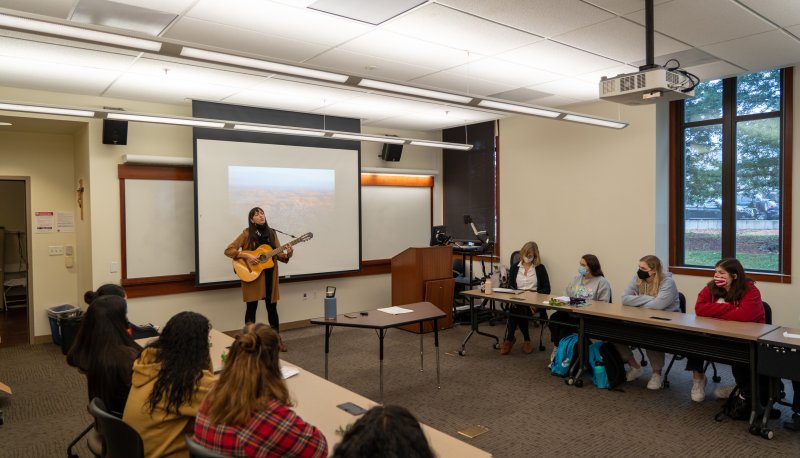 In JCL 10, the introductory class in SMC's Justice, Community & Leadership Program, Professor Suzanne Schmidt typically sets aside her final class session for a celebration of collective learning. The materials covered in JCL 10 are challenging, as students are asked to consider their own and each other's perspectives, life experience and positionality in relation to topics such as race, class, gender, ableism, immigrant rights, and inequality in the U.S. education system. In pre-COVID times, students would typically celebrate the end of the semester over food and drinks. This semester, Schmidt invited local musician and activist Diana Gameros to give a private concert and guest lecture for their final class session.