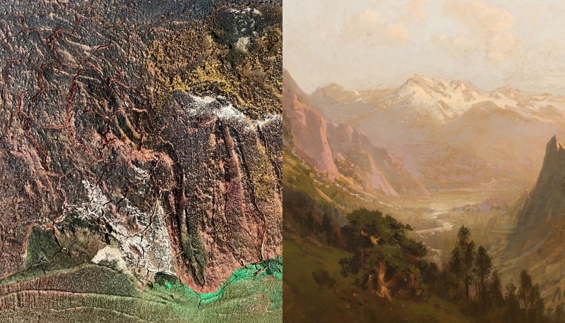 Image Credit Line: detail left, Milton Komisar (1935) Techtonic Plates, 2003, Acrylic and concrete on canvas, Gift of the artist, Saint Mary's College Museum of Art Permanent Collection. [4.2006.2] detail right, William Keith (1838–1911) High Sierra Canyon (c. 1900–1905) Oil on canvas, Gift of Benjamin H. Lehman, Saint Mary's College Museum of Art Permanent Collection [0-91].