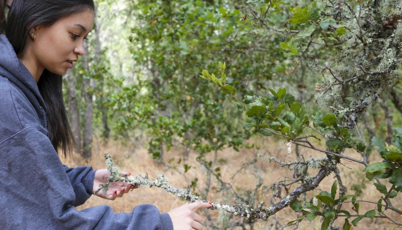 On a rare chilly summer morning, Vanessa Carsey '23 and Professor Jessica Coyle collect lichen off local oak trees. The air is a bit smoky and the air quality in Contra Costa has been fluctuating with fire season already in full swing. Lichen, a complex life-form that is a symbiotic partnership of fungus and an alga, may not look like much, but they play a key role in fire recovery research.