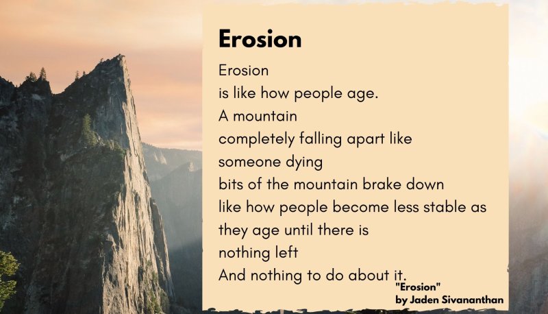 Q: The poem compares the erosion of a mountain to a human’s old age. How did you think of comparing the two?