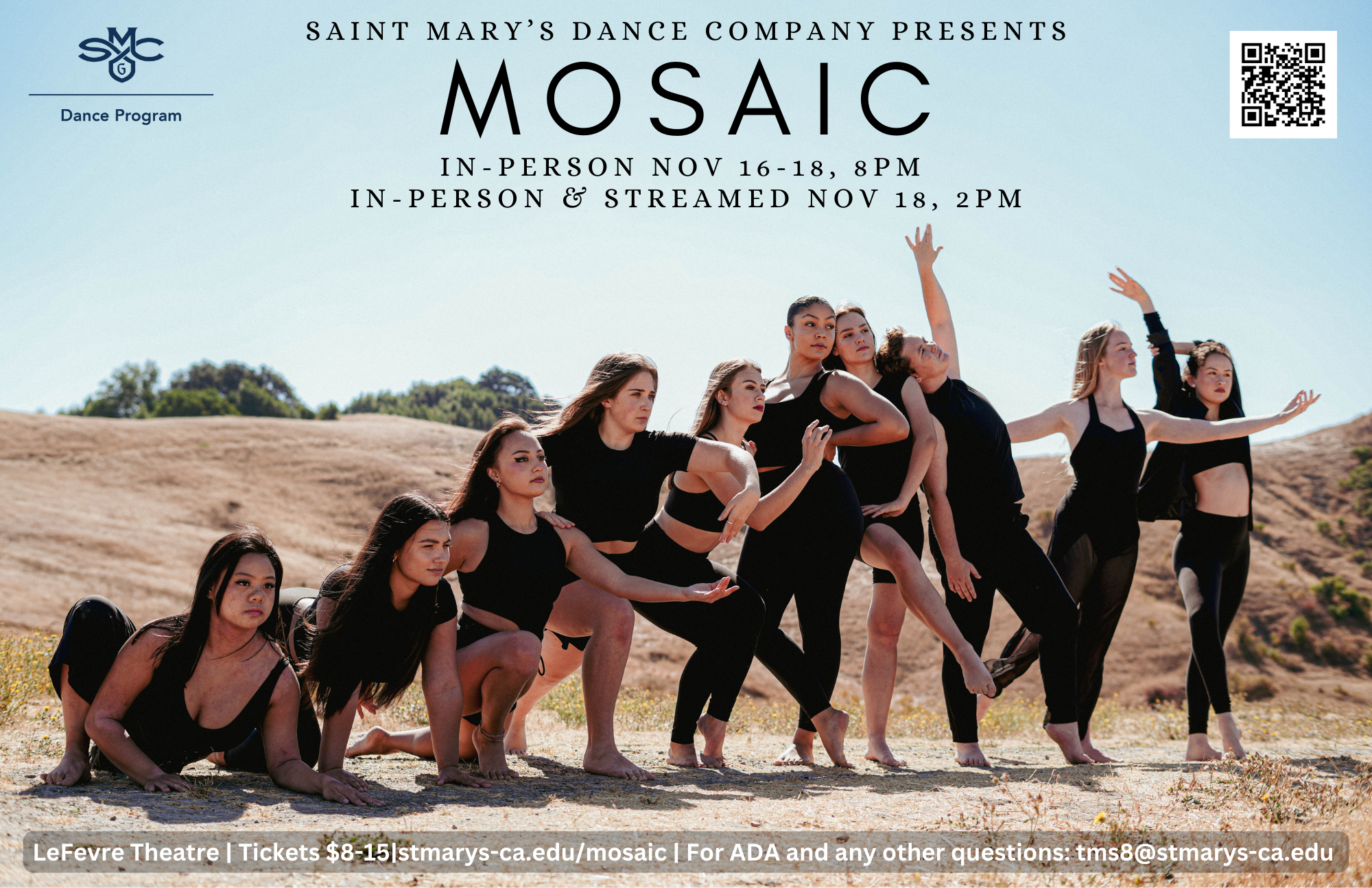Moraga, CA, October 13, 2023 - The Saint Mary’s College Dance Company is excited to present the compelling performances of this fall’s dance concert, Mosaic. This shared student-led showcase is choreographed, produced, and performed by the Dance Program’s Class of 2024: Caitlynne Bennett, Lou Cooper, Carmen Cortez, Olivia Gutierrez, Sami Kennedy, Kiana Kwong, Isa Madath, Claire Roberts, Emma Stevenson, and Macy Yu.