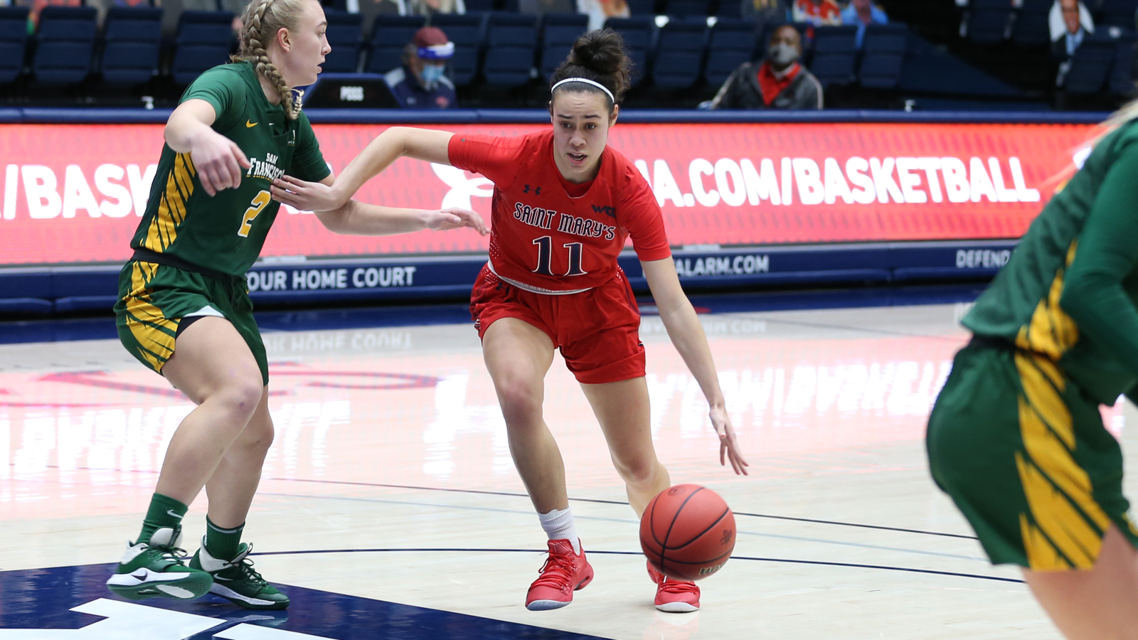 Ellie Croco recorded her third-straight career-best performance, putting up 13 points for the Gaels, including 10 points in the first 15 minutes of game action, and going 3-4 from range…the Gaels got a familiar face back in the lineup as Emily Codding played for the first time since tearing her ACL in January of 2020 and she played 14 minutes, scoring nine points and grabbing eight rebounds…Taycee Wedin went 3-6 from beyond the arc to get her to 11 points on the night, part of a 10 three-pointer effort from SMC, their fourth such game of the year.